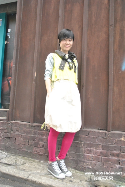 有才:浅黄,灰绿,亮得发白的奶白,以为这一身除了领口上的黑色再不能给我们再多惊喜时,一双艳闪闪的枚红色legging突然出现在我们眼前。其实原本这一身泡芙般的打扮已经很讨喜了,用legging来突然收紧,最后用帆布鞋打底倒是给我们一个倒锥型的结尾,可圈可点。