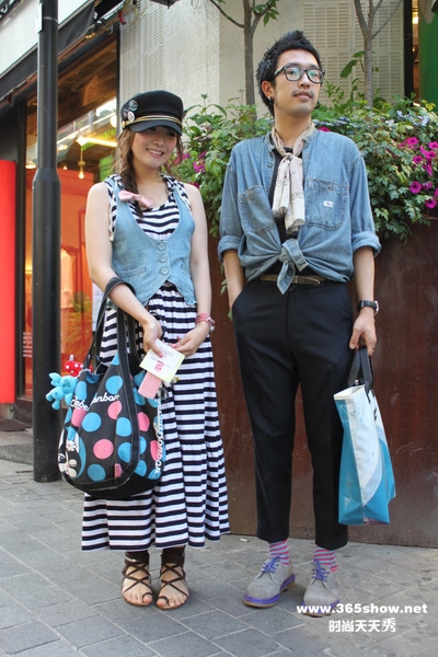 有才:这一身丹宁情侣装有才很是喜爱,并没有刻意地穿上一模一样的款式,而是利用相同的元素来强调爱的存在。而男生脚踝处的横条袜若有似无地与女生的长件式横条纹maxi dress相呼应,真是有心的细节处理。这一对几乎在各个点上都做的很到位,无论是男生的领巾还是女生的帽子,都是点睛之笔。不得不提一句,其实在看贴的男人们,不妨也尝试一下将自己的衬衫系起,只要你能穿下瘦腿裤,效果应该不差。