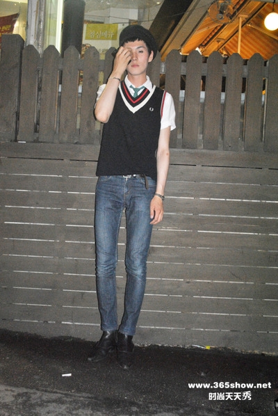 有才:old school look学院派造型,也许是最传统意义上的韩国范。fred perry的v领背心配衬衫领带几乎就是学院派最传统的造型。配上瘦腿仔裤和箭头鞋,有一点嬉皮有一点乖。