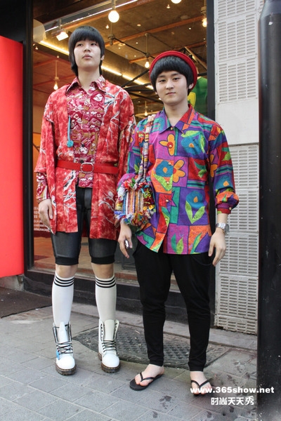 有才:波普色彩的无厘头造型走在街头很是能抓住人们的眼球,但你要说这些无章法的搭配如何如何借鉴,倒是见仁见智了。花色衬衣搭配哈伦裤加上人字拖,扣上一定圆顶礼帽,倒是不好看,却也有一丝幽默的味道。后面那位就不说了,其实爱怎么穿是自己的事,要是杭城有人这么穿,有才也会很欣慰的,起码说明大家的接受度提高,百花齐放了。
