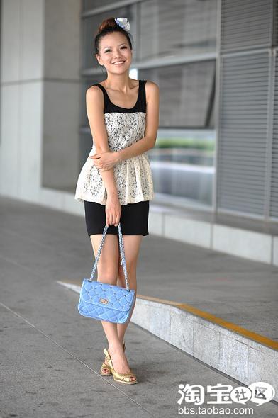 7.卸肩木耳花边短袖+超短裙子+牛仔包