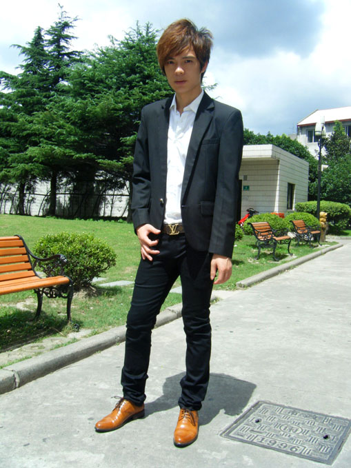长袖西服,典雅端庄,纯色低调而奢华!下身打牌英伦格子紧身裤,很正宗的欧美范味道就出来了。很多人说像美国黑手党,黑社会老大!还有看我带的链子眼红 ,说我 是爆发富! 呵呵!