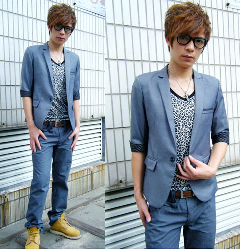 夏天马上要过完了,秋天马上就到了,外套还是 轻薄为宜,中袖西服为最佳选择,清爽透气,简约干练的版型让这款浅灰色的西服给人视觉很清新,配上时下流行的猫头鹰眼镜很与文雅气质!内搭配豹纹T恤,显示出模特的非凡品位!