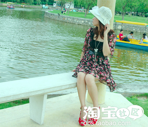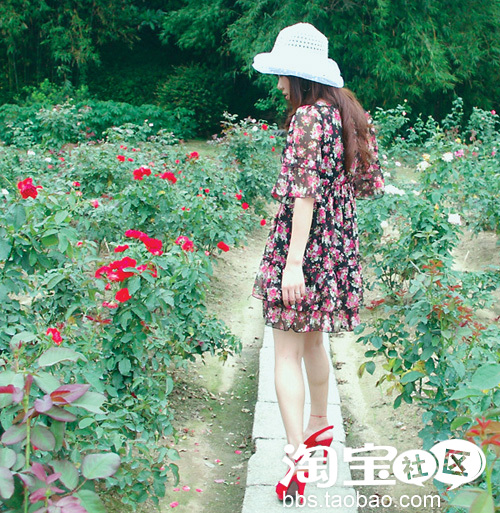 NO.2 草编帽+雪纺碎花连衣裙+红色鱼嘴高跟鞋 打造幽夏多情浪漫公主