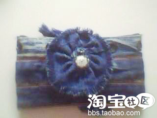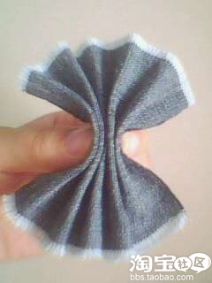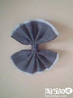 3.再剪一条宽为1CM左右的长布条,长度以能绕蝴蝶结中间为最佳