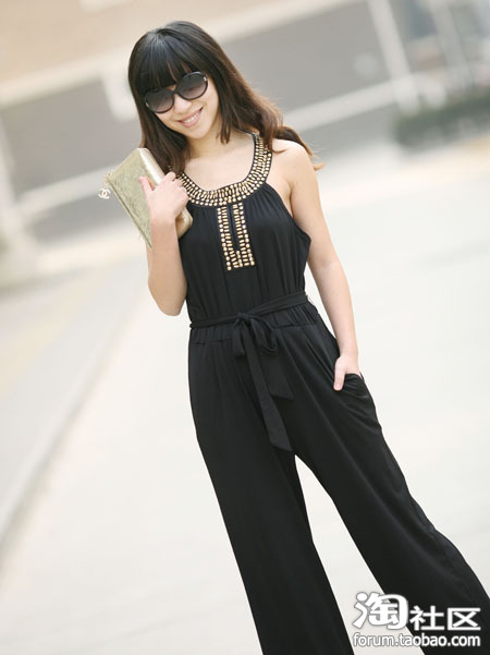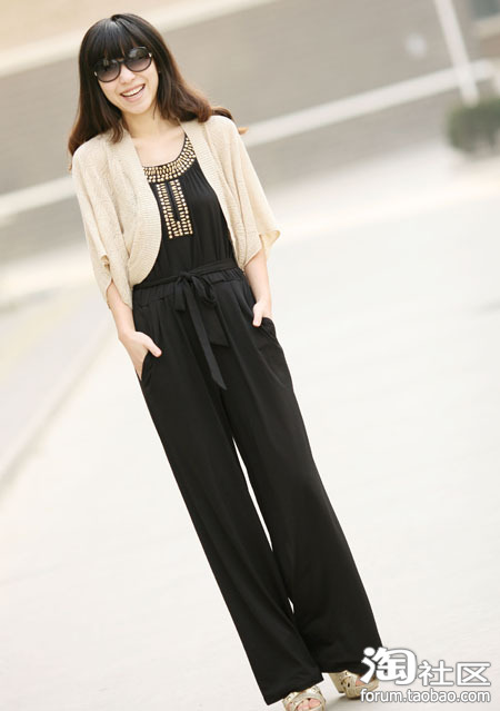 铆钉连体裤+亚麻披肩开衫,简简单单的一套,但是不是依然感觉到强劲的能量?