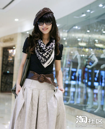 黑色紧身小Tee+大摆亚麻长裙+黑白撞色丝巾