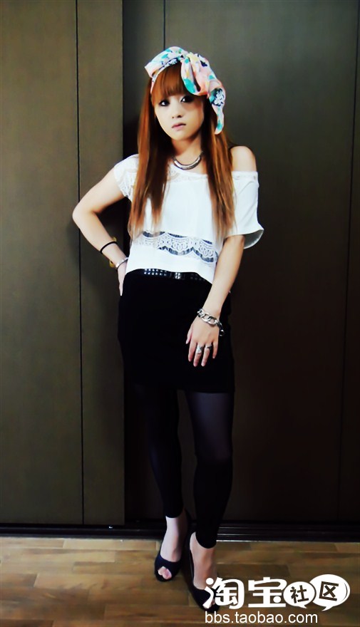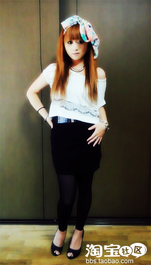 蕾丝切片超短衫+超弹力棉毛布高腰超短裙+超炫配色多用丝巾
