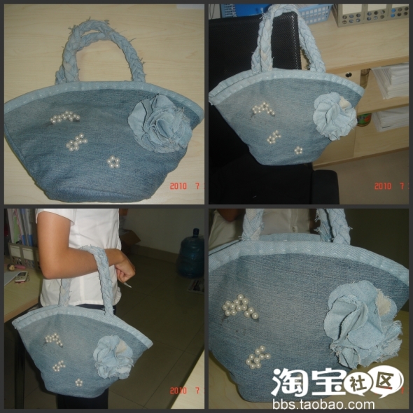 材料用的是老公的牛仔裤,老公好几条牛仔裤都在关键部位破了几个洞洞(hoho),没法穿了,偶在社区上看到姐妹们用牛仔裤改的东东很漂漂,手痒痒,也自己乱搞了一下,希望大家不要扔鸡蛋就好。