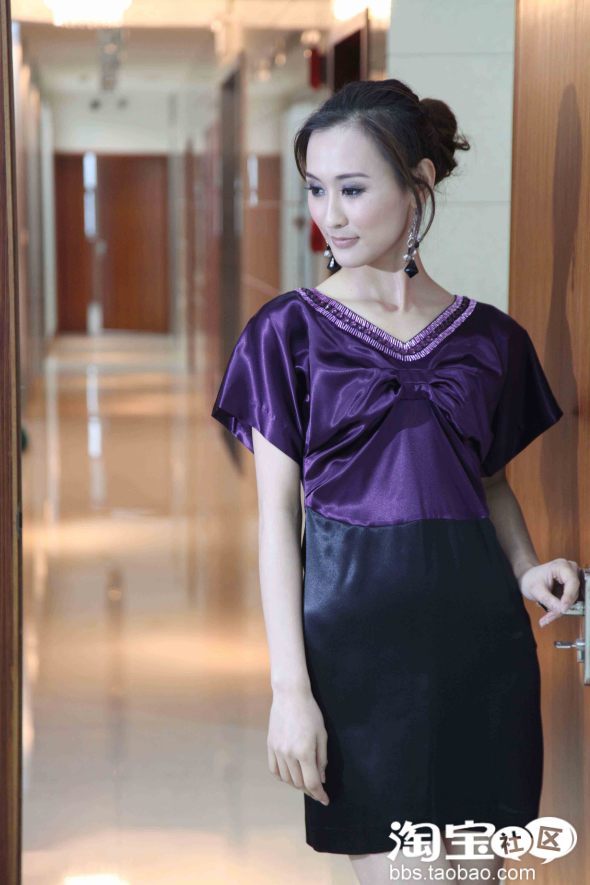 低调的色彩,却并不沉暗。领口上缀上亮紫色珠管,再配合锆石光芒,映射出迷人的奢华光芒。轻熟女的风采就在于此,虽不事张扬,却一定有着她独到的吸引力,绝不会让自己受目光的冷落。摇曳的步伐之间,尽是一派柔情。