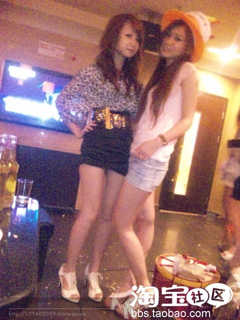 豹纹拼接的黑色连身短裙,加一条银色腰带更闪亮哦,只是腰带有点掉了 不好意思,白色的绑带高跟鞋。旁边亲爱的同虽然只是粉T加牛仔裤却也一样好看只要配上合适的发型和高跟鞋、
