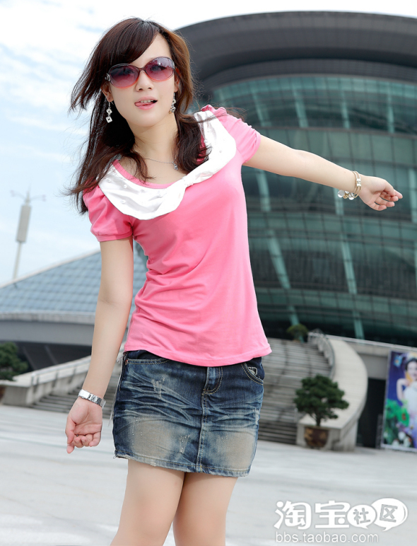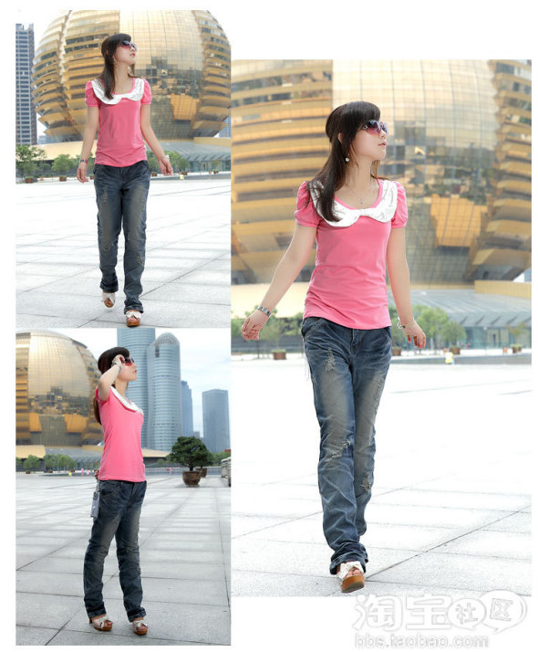 甜美搭配一:粉色的t+牛仔裤+高跟鞋