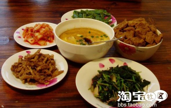(注 所有的菜都是全自产的哦!蔬菜是自己种的 鸡蛋是自己养的鸡 泡菜也是自己做的!