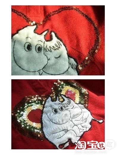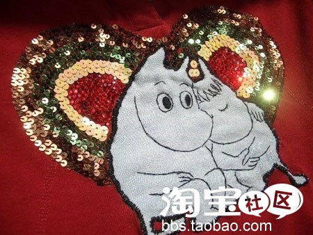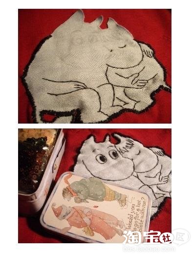 第2步:把剪下来的牛仔布缝到红T的胸口,这1步ms只有1张图,其实却是最费工的,手工锁边累死个人阿。第3步:翻出n色亮片1盒(这个熊盒子俺很喜欢...)
