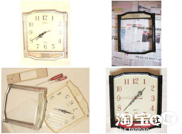 一个很旧的钟表,先卸开零件------用了一整瓶黑色指甲油涂边框,丙烯颜料黑色涂出来没光泽,所以牺牲了一瓶指甲油涂完,晾干------把数字用红色丙烯颜料涂改色,外框上也涂上部分红色呼应,大功告成~~
