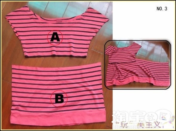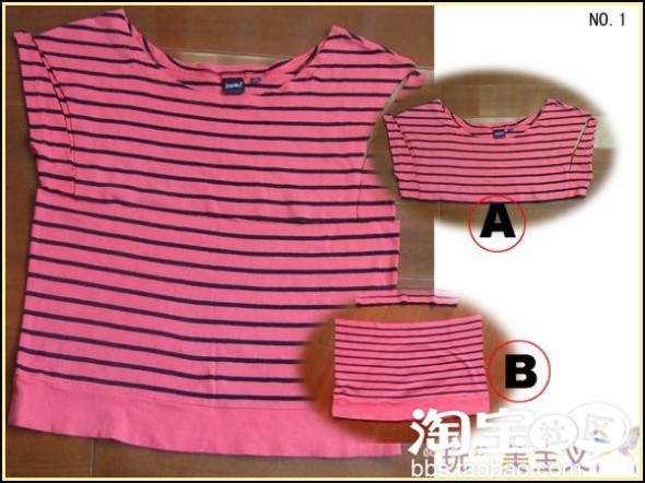 说明:先按自己的身材比例,把衣服从合适的位置剪开,分成A和B两部分。