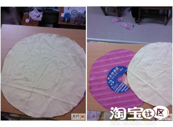 2,将光盘放在两张圆形布得正中间,用笔在边缘上画上圆,和光盘大小一样,然后,在中心园得边缘向两侧画出像太阳得光芒一样得直线。