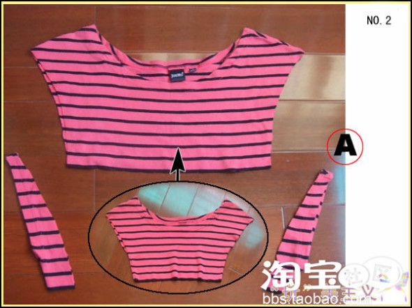 说明:①我们把A部分先拿来处理一下。由于最需要改变的是尺寸,所以从旁边袖子开始,剪掉一部分,事先一定要量好尺寸,用划粉在布料上画好位置,剪坏了,可就不妙了。