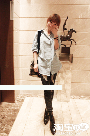 6,铆钉牛仔衬衣+破洞牛仔裤+高跟靴