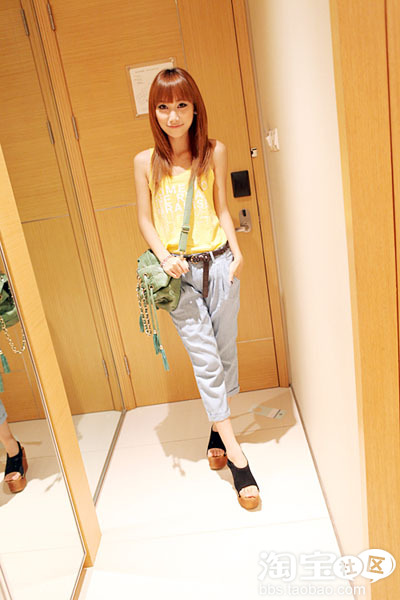 2,糖果色背心+浅蓝色牛仔哈伦裤+木屐