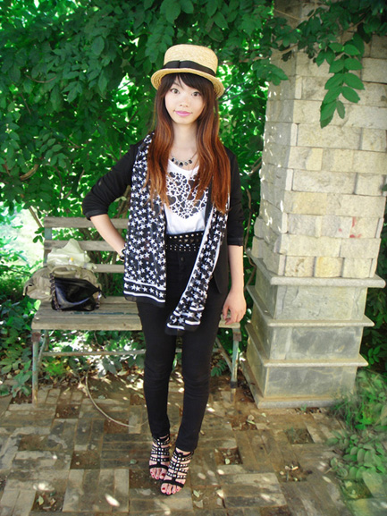 黑色西装外套+韩国代购爱心T+韩国代购高腰裤+背带+五星丝巾 打造酷酷韩国风