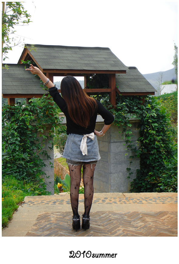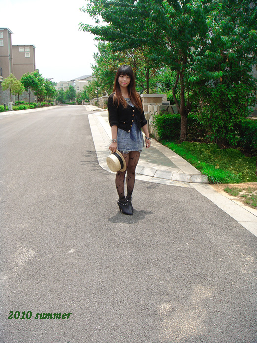 平顶帽子+针织小外套+牛仔裙+镂空丝袜+柳丁鞋 打造甜美性感风