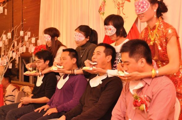 玩游戏“甜甜蜜蜜”,看谁家喂蛋糕快,哈哈,很好玩的,左起第二组夫妻,赢走了大礼:一对漂亮的心型大抱枕和情侣棉拖鞋,其他来宾也都有情侣棉拖鞋哦~