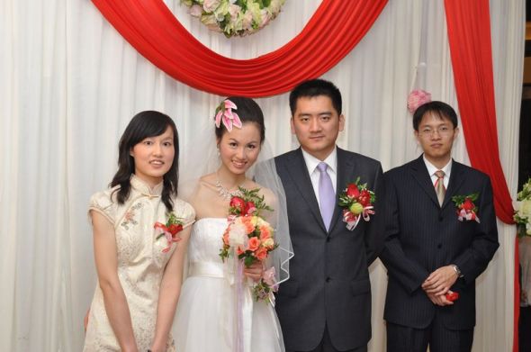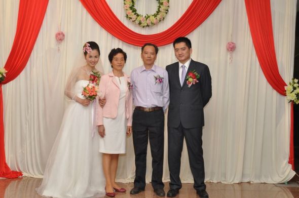 拍摄时间:2009年11月28日,拍摄地点:厦门航空宾馆~~婚礼上,和公公婆婆的合照~婚纱也是在淘宝定做的,但是我完全不适合这种抹胸款式,加上婚前忙得瘦到90斤(我170~),穿上老掉;收到时候已经临近婚期了,想再定一件也来不及啦。