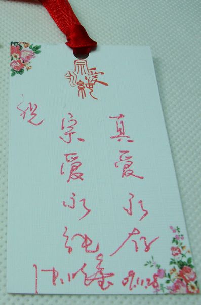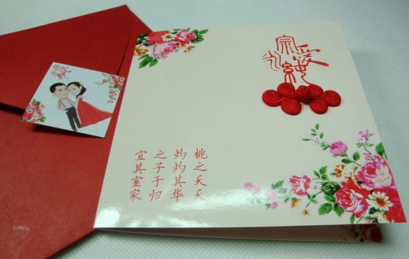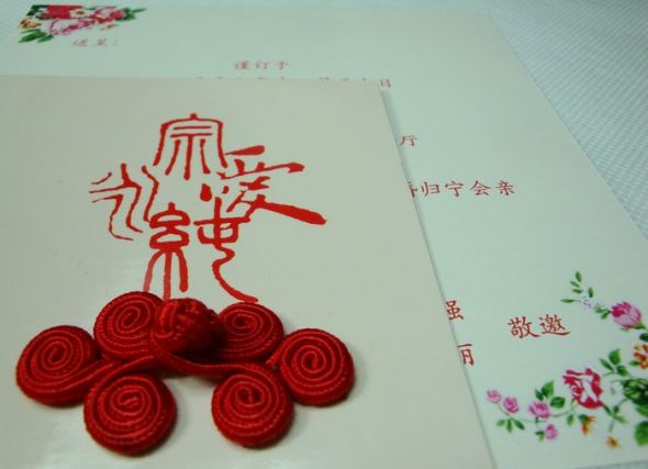 下面是我自己设计的请柬,在淘宝找的印刷,遗憾的是印刷公司印成光膜,比较不好看。我还在淘宝买了红色盘扣,画龙点睛,寓意我和相公“永结同心”~