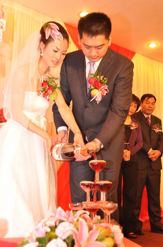 倒香槟仪式~本来是不喜欢这这种环节的,最后不能免俗……我们的背后是我亲爱的爸爸妈妈,旁边还有公公婆婆,没有照出来,婚礼上我们送个他们四老两台按摩足浴器,希望没有我们陪在身边的日子,他们能健健康康。