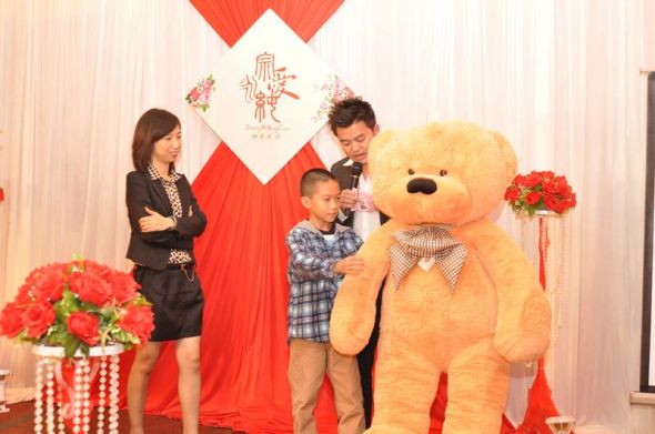 来参加我们婚礼的第一位到达来宾获得了BODY大抱熊一只,足足1米6哦~婚礼的舞台背景也都是我自己设计哒~~