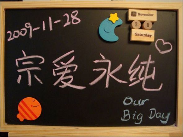 因为相公的名字有个“宗”字,我有个“纯”字,所以我们婚礼的主题是“宗爱永纯”,取意“钟爱永存”!我们在结婚典礼上没有交换戒指,而是交换了一对天梭的手表,以手表来纪念我们的一见“钟”情,“钟”爱永存。