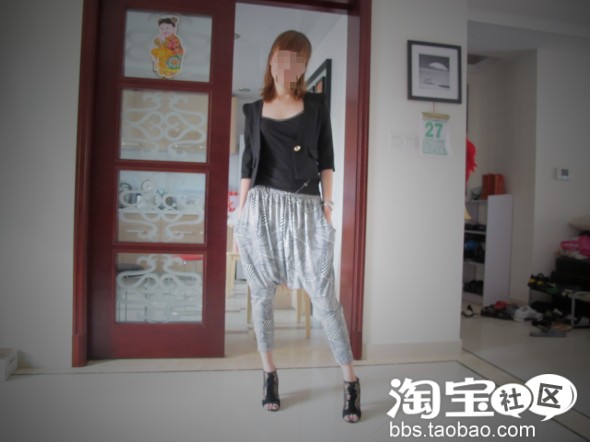 我自己搭配滴 没有露脸 因为没有化妆 哈哈 这套衣服 一定要化点眼影才行的 哈伦裤 要配的好看 切忌上身穿宽松的衣服哦 宽松的款一定要别进裤腰带里 才有范 发型一把抓或披肩是最理想的 千万不能加雪纺蕾丝元素哦 我这身以黑白为主 略显单调 还缺一条金属长链点缀一下。。。