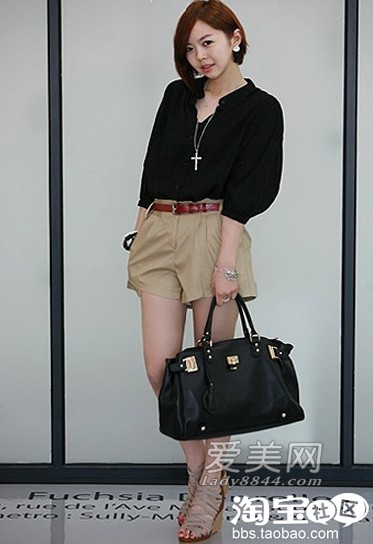 浅绿色的雪纺衬衫就产生一种复古的感觉,搭配蝴蝶结短裤,复古跟甜美的碰撞,脚上搭配条纹蝴蝶结高跟鞋,非常甜美,适合走甜美路线的OL!