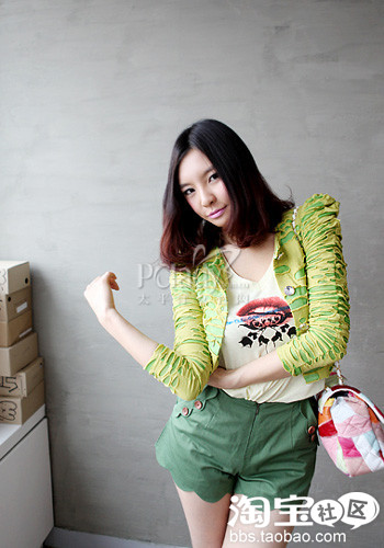 时尚点评:草绿色的波浪边短裤剪裁精准,搭配草绿色镂空耸肩款的小西装,尽显时尚小女人的气质。如果你想减龄,搭件T会很显小哦。