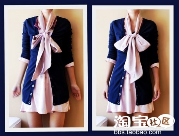 现在来看手法,要诀很简单也很关键。活结搭好后,你会发现,飘带总会是一前一后,一上一下的~~