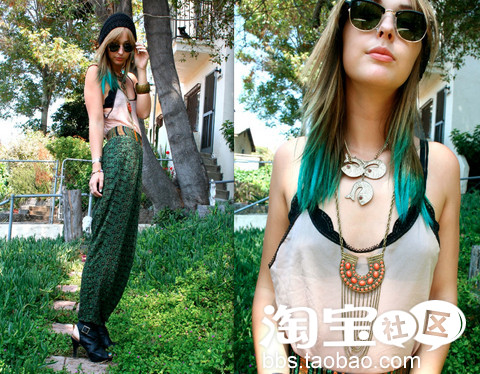 一席高腰绿色花长裤,仿佛就像一只孔雀。饰品也很精致。