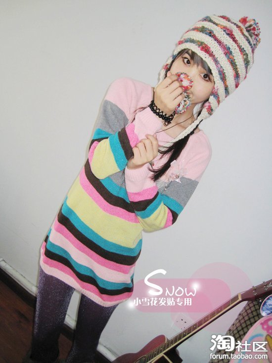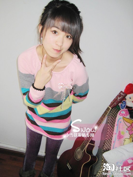 条纹甜美长款毛衣,下面直接配打底裤,紫色亮晶晶的,是不是整体感觉不错哈!