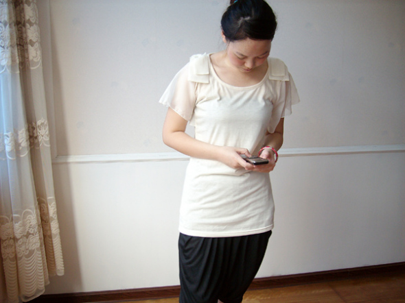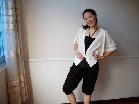 这件衣服的另外一种搭配,+哈伦中裤+红色手镯,比较不错。呵呵