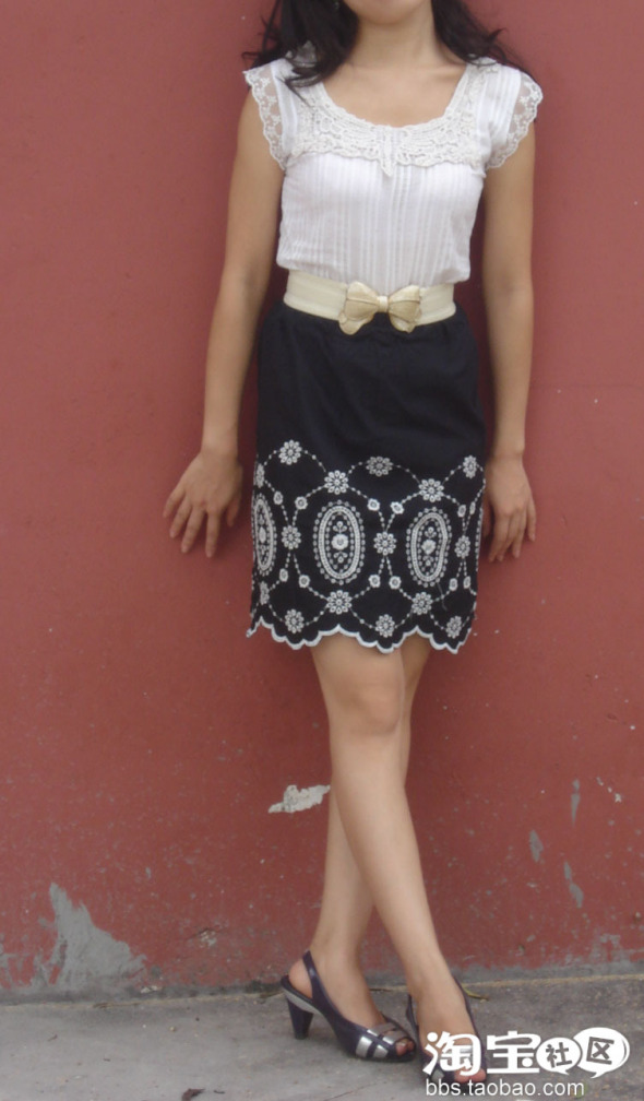 加一件很简单的水桶裙,那时候是喜欢这块布料的刺绣,觉得古典 臭美的整体效果 ,加了条腰带,怎么样,还行吧,希望大家会喜欢。