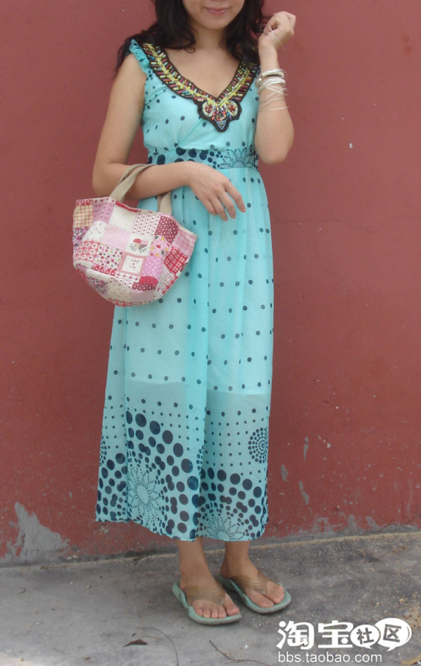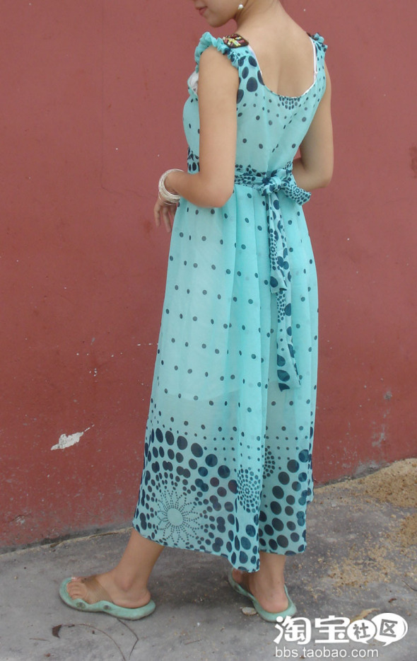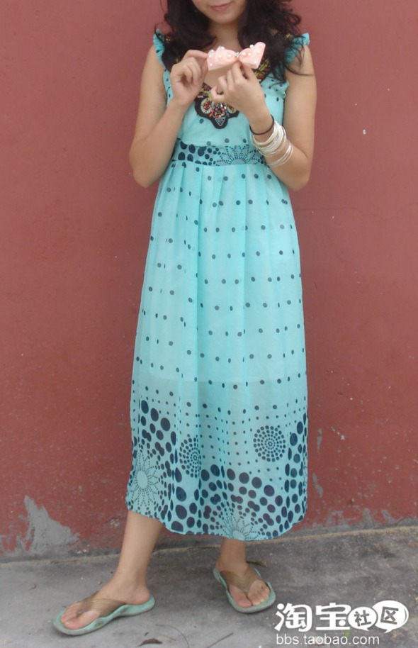 4. 这是我大爱的一条,今年长裙当道 ,去逛街时看到满街的长裙自己也好想要啊 。但是又不想和别人的一样 所以一直都没有买到喜欢的。买这块布的很喜欢它的颜色和图案 ,蓝绿色感觉很清爽很舒适 ,因为是雪纺布穿起来有很凉快 ,图案是简单的圆点排列出渐变的效果,最后以大大小小的圆点排列出可爱的花朵的图案。希望大家会喜欢 。