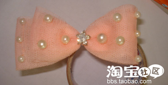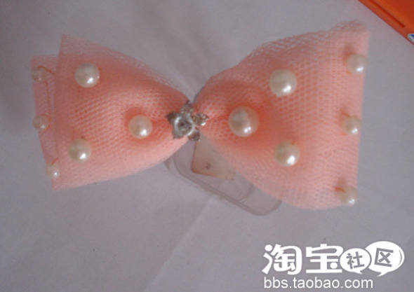 这扎好的蝴蝶结上缝上珠珠,再用U型夹卡住,就大工告成了