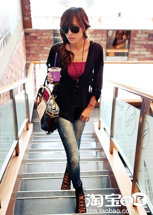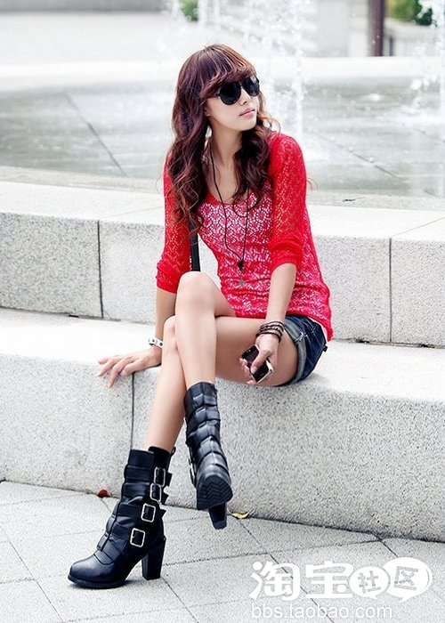 韩国时尚See-ThroughT恤-性感网丝T恤,鲜亮的红色,镂空的设计,里面搭配白色小吊带背,下身搭配短裤,身材高挑。