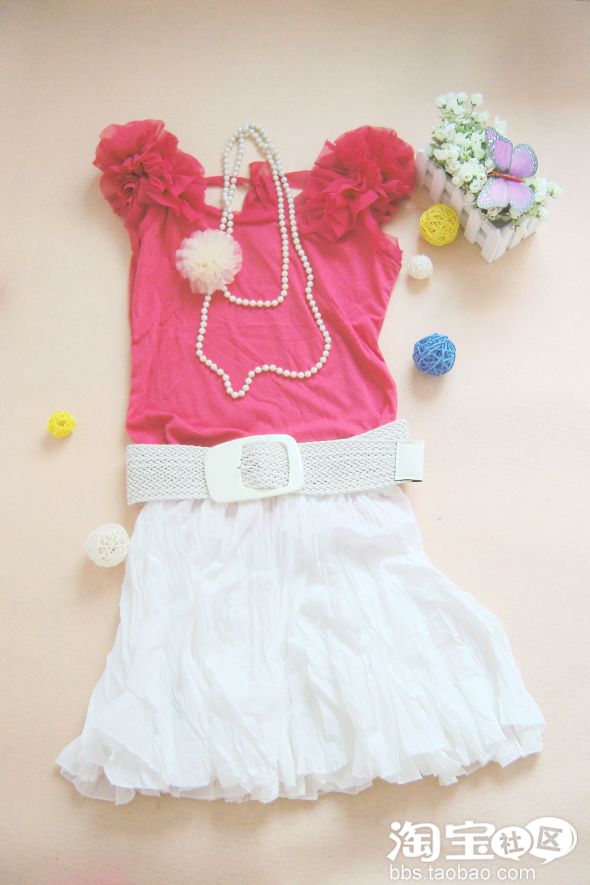 红色的木耳边T恤配白色的裙子,既有学院风又