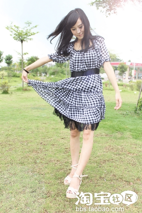 黑白格子长裙+高绑鞋=打造活跃公主风