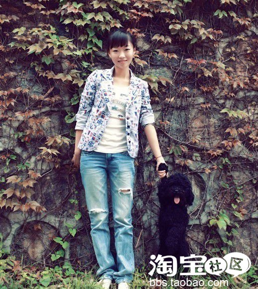 带家里的狗狗外出游玩,休闲的打扮,灰色棉质西服+磨白的直筒牛仔裤。
