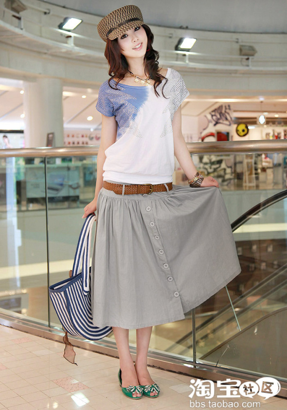 2010夏装新款 韩版纽扣装饰 纯色半身 纯棉裙子 送腰带