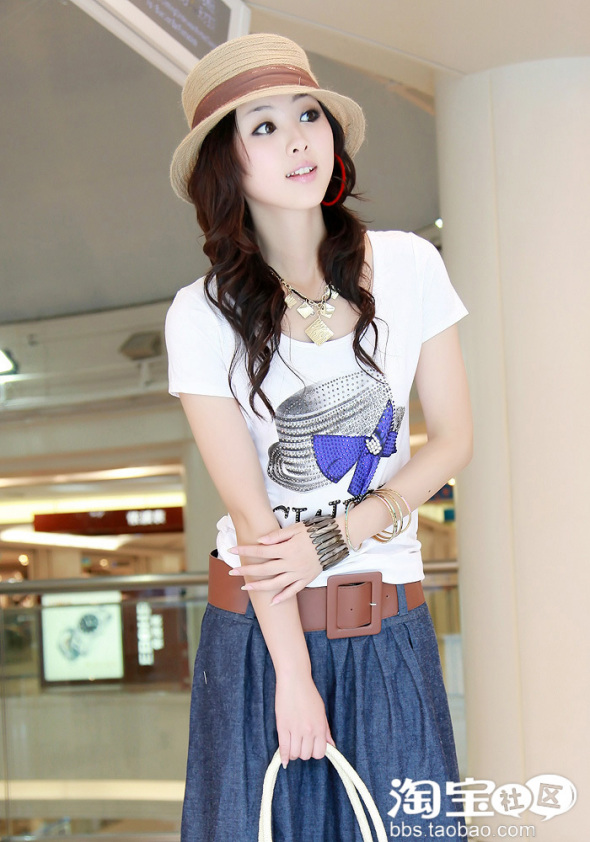 2010夏装新款韩版个性牛仔花朵 蝴蝶结腰带 圆领 短袖T恤