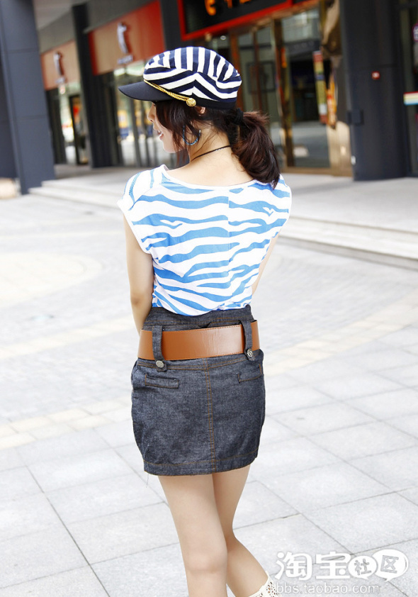 2010夏装新款 韩版时尚 高腰 帅气腰带 牛仔收褪半身裙子