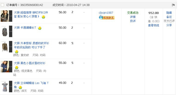 终于有一天决定和大狮说话了,没想到大狮真的好热情啊,我们2个就开始调侃起来,衣服倒被忽略了,于是乎一直聊了断断续续2小时,从化妆品到鞋子啊 样样分享,第一次遇到这么平易近人的店主,人美心也美的,心情那个好啊。。。一直到现在这半年里 我陆陆续续的 卖了N回 截图证明